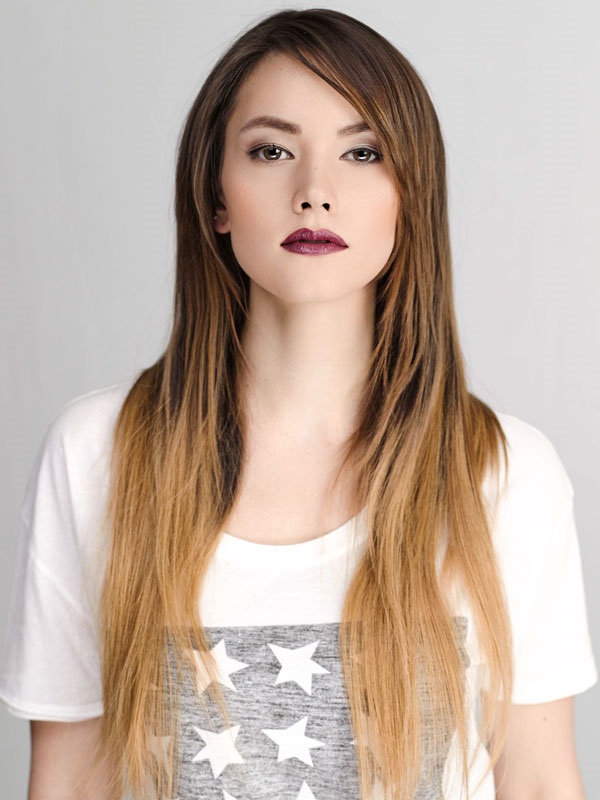 - The ombra technique on dark-blond hair looks beautiful and impressive. At the roots, the curls remain almost a natural tone, and the tips are colored with natural shades of brighter light brown shades - this makes the hair look natural, as if they were burned out in the sun. With the same success you can highlight the strands or paint them in different colors, for example, in a red, copper, reddish tone. But here, of course, you have to make a start from the color of your eyes and skin.