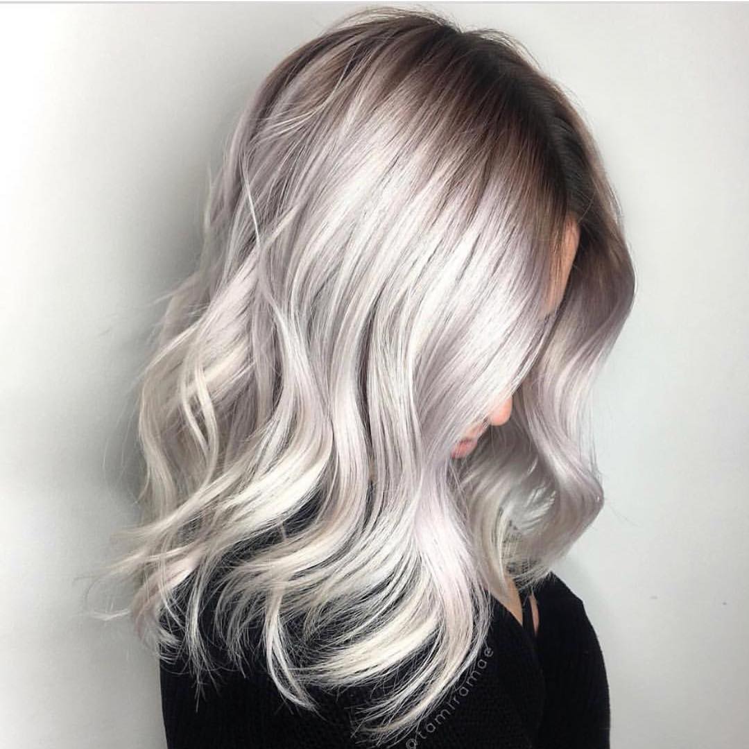 Partial dyeing is a great way to get pearly white curls without spoiling the hair roots. In this photo, the color transition looks contrasting, but not too sharp. Such hairstyles look most impressive with a perm. For a solemn occasion, you can wind curls curling iron, and in everyday life wear straight hair, because black roots still remain in trend.