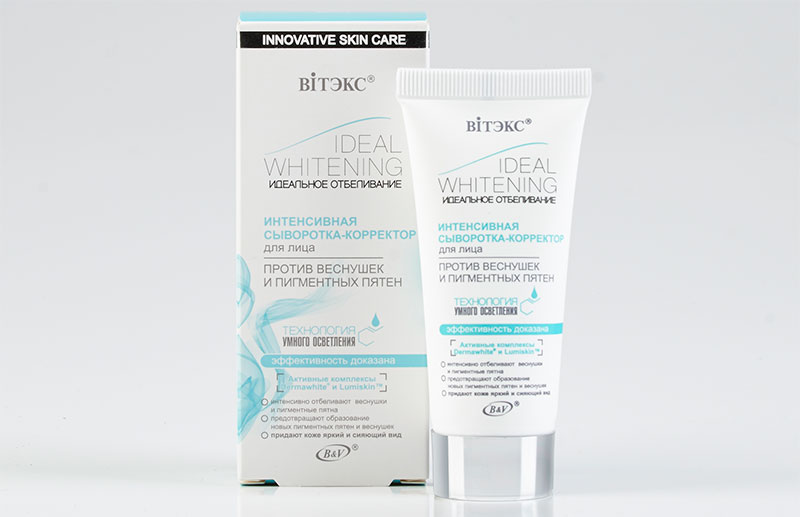 - Vitex Ideal Whitening. With this tool you can eliminate freckles, age spots. This is due to the complex composition of the cosmetic substance and natural ingredients. Use the product twice a day. The texture of the medium is quite light. The visible effect is noticeable after two weeks.