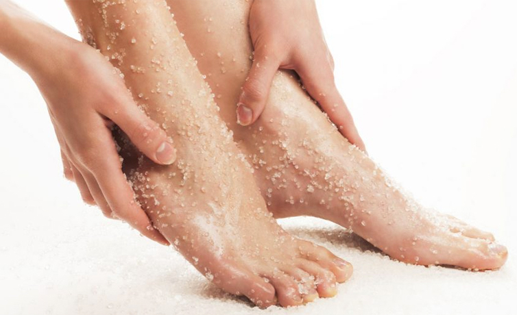 In order to make a scrub, you need coffee with grains of medium size, sea salt. All this is mixed in a ratio of 1: 1. To the mixture, you can add a small amount (about 25–35 ml) of vegetable oil. This consistency is applied to the feet after they are heated. Make a massage in a circular motion, and then wash off.
