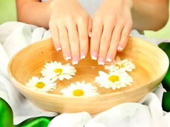 For the preparation of herbs with a decoction of herbs you will need a mixture of various herbs, which can be purchased at the pharmacy or assemble in the summer on their own. Chamomile, burdock and St. John's wort flowers are suitable for strengthening Add one teaspoon of dry herbs to the container and pour boiling water over it, let it brew for 10-15 minutes. When the temperature of the broth becomes comfortable, dip your fingers in a container for half an hour. After the bath, blot your hands with a dry cloth or towel, and then use a moisturizing nourishing cream.