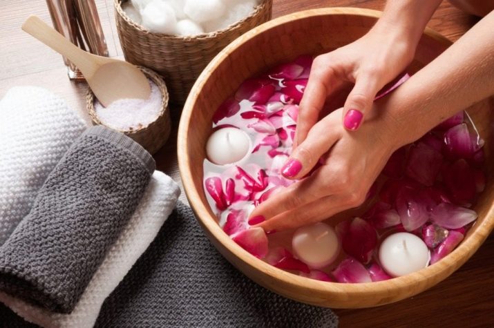 It is quite possible to use the usual coarse salt, which is in every kitchen. For this recipe you will need a glass of hot water and thirty grams of salt. Here you can add a few drops of pink or some other cosmetic oil, and you can add exactly ten drops of iodine. After the procedure, hands should be thoroughly washed and moistened.