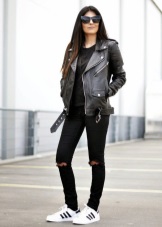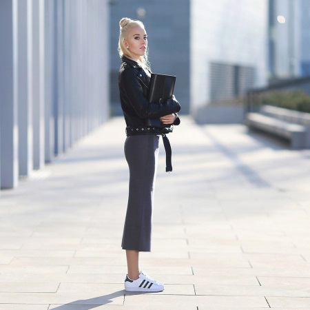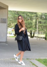 Original look Adidas sneakers with a pencil skirt, a blouse and a black jacket. This is a rather unusual image, but this makes it even more attractive. In this case, sneakers should be discreet colors, and their sole - not too prominent.