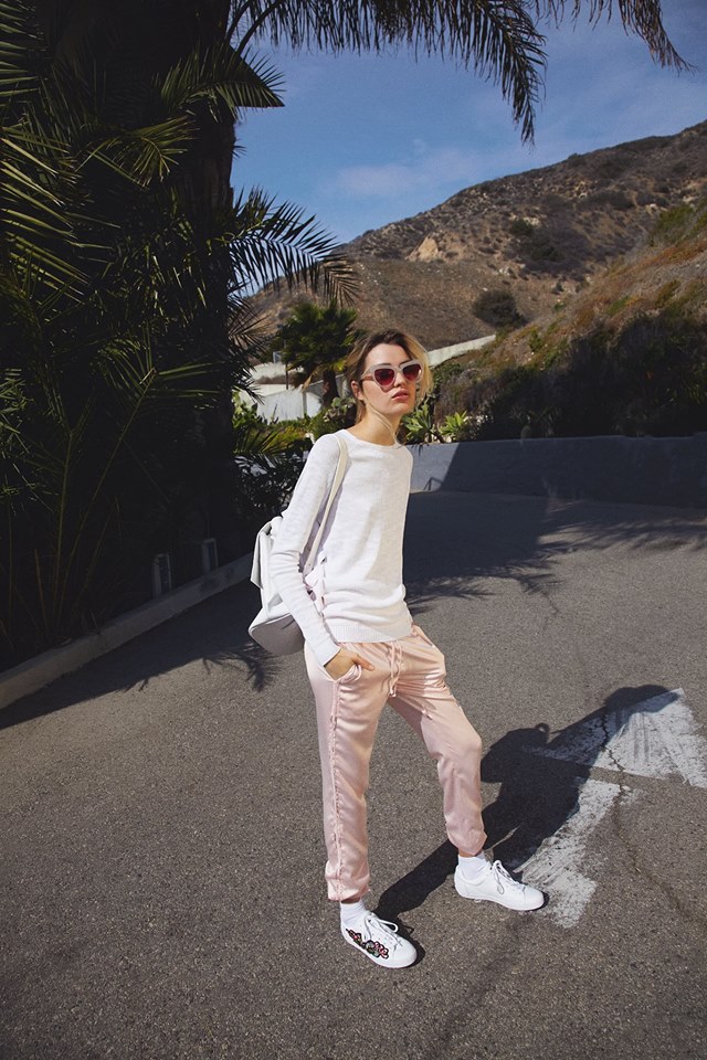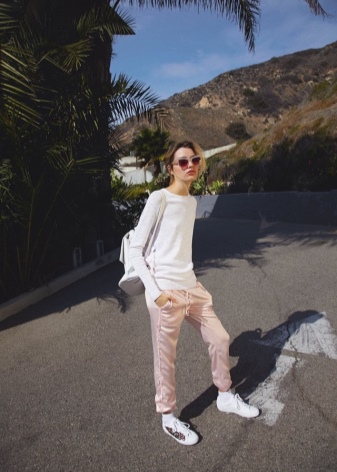 - Minimalism is one of the most popular trends, which is almost fixated on monochrome and simplicity of images. It is proposed to dress in gray pants with a high waist and oversize sweater under bright sneakers with inserts that will harmoniously blend with the top.