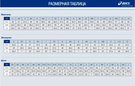 The size range of Asics sneakers does not coincide with the Russian, but is focused on American and European sizes. Because it is very important not to make a mistake when choosing your size. For this there are special tables and dimensional grids.
