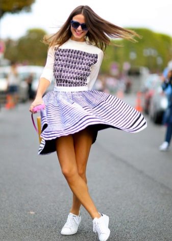 White sneakers, worn with a tight-knit dress - the perfect solution for an evening rest in the fresh air. A miniature handbag with a long strap will make the image more sensual.