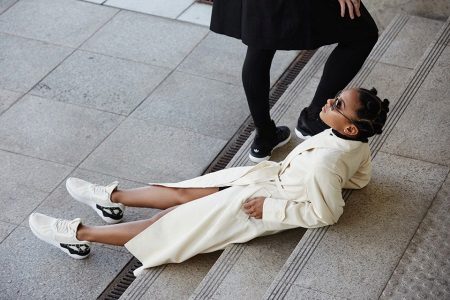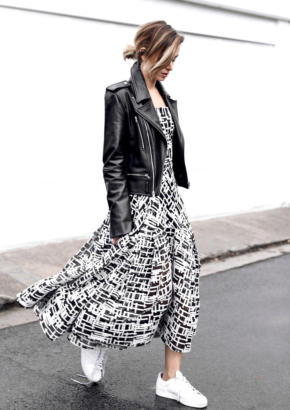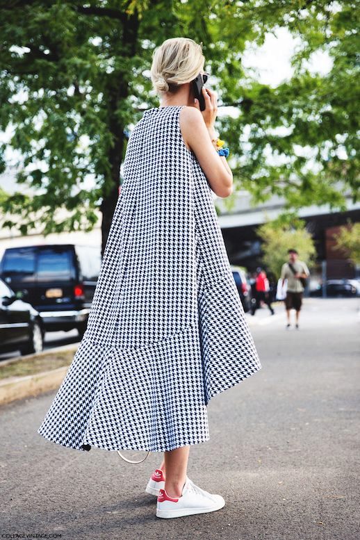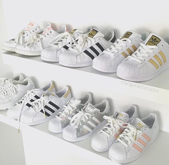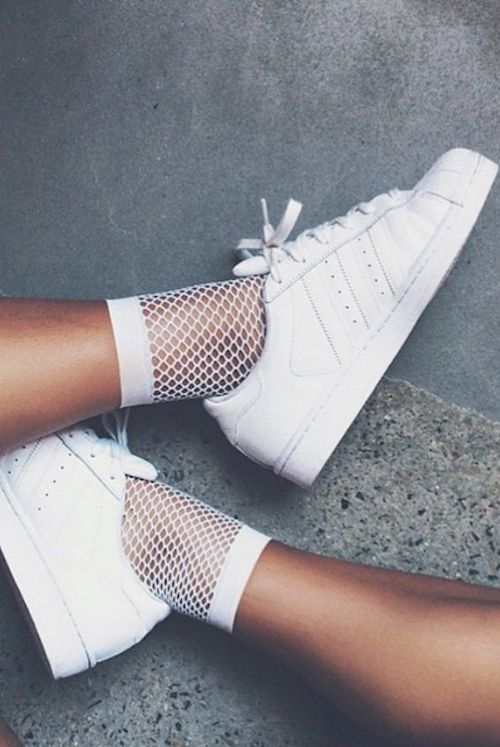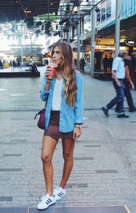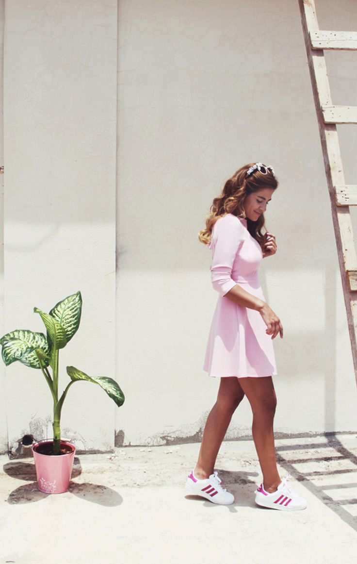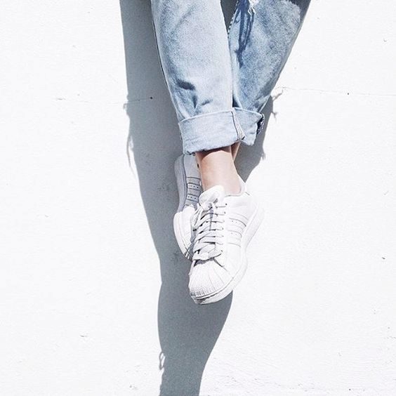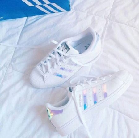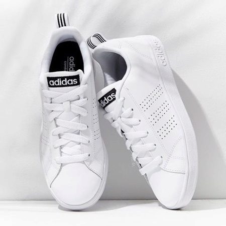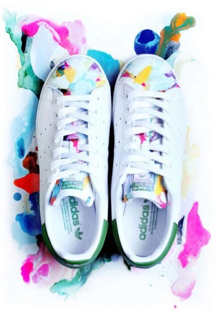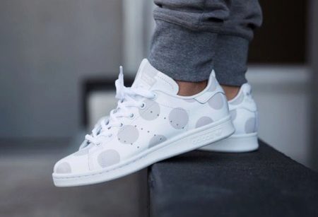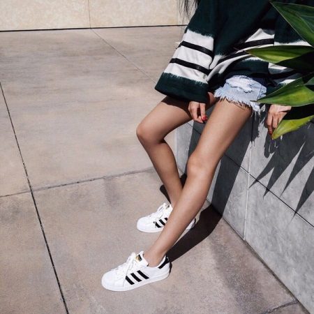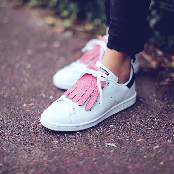 So, Adidas white sneakers are appropriate to wear with flared and pleated skirts a la barbie style.