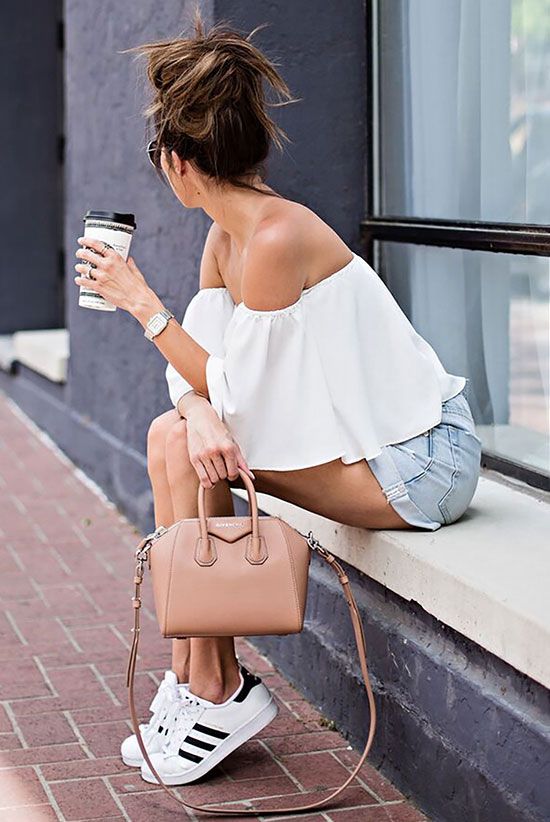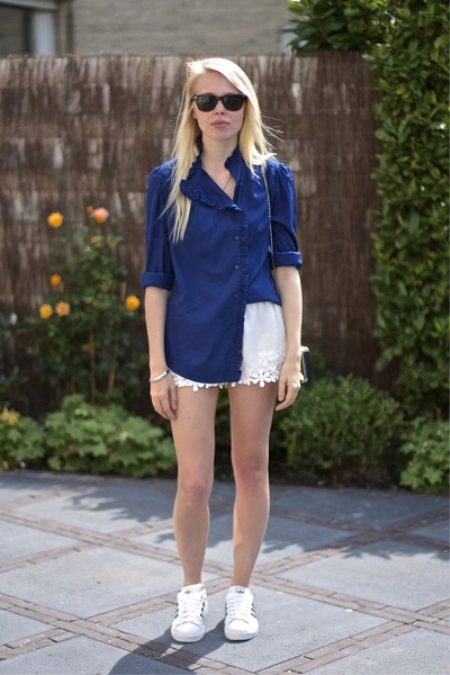 Win-win simple and seductive option - white sneakers, worn with high-rise shorts and a white top. The top can successfully replace a loose shirt or striped knit blouse.