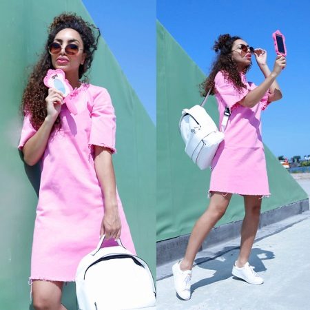 The dress of a spacious cut of feminine pink color, hiding figure flaws, together with such shoes looks extremely romantic.