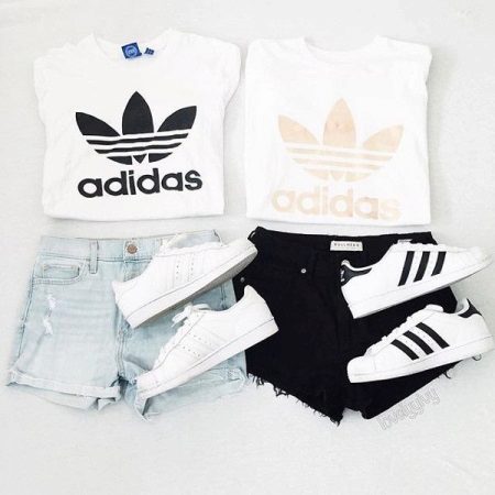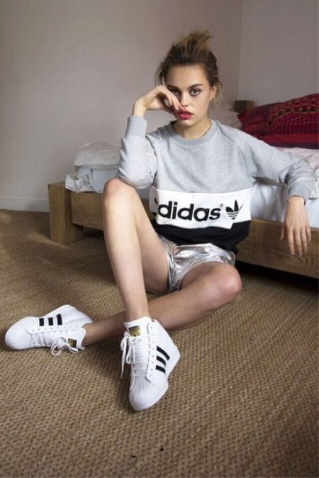 The oversized sweatshop and shorts go well with Adidas sneakers.