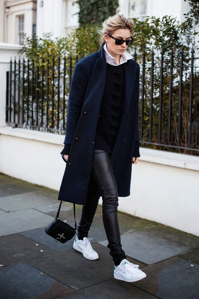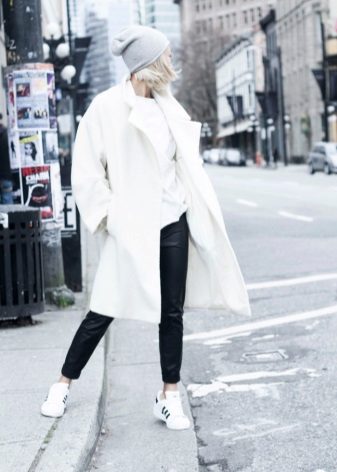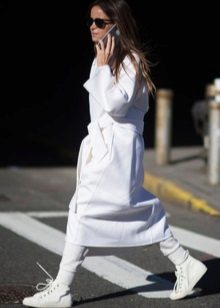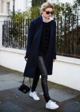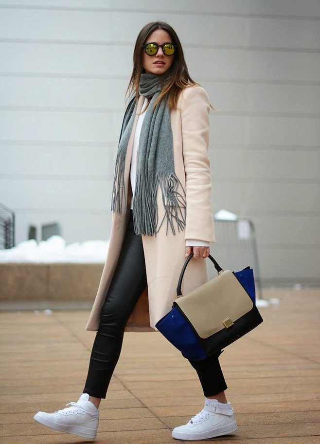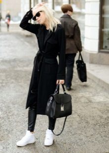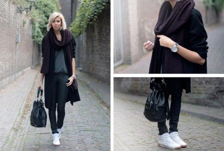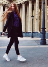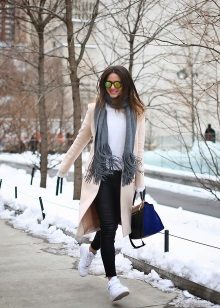 - Sneakers fit harmoniously into a tandem with a coat or trench coat, while the bow looks comfortable and cozy.
