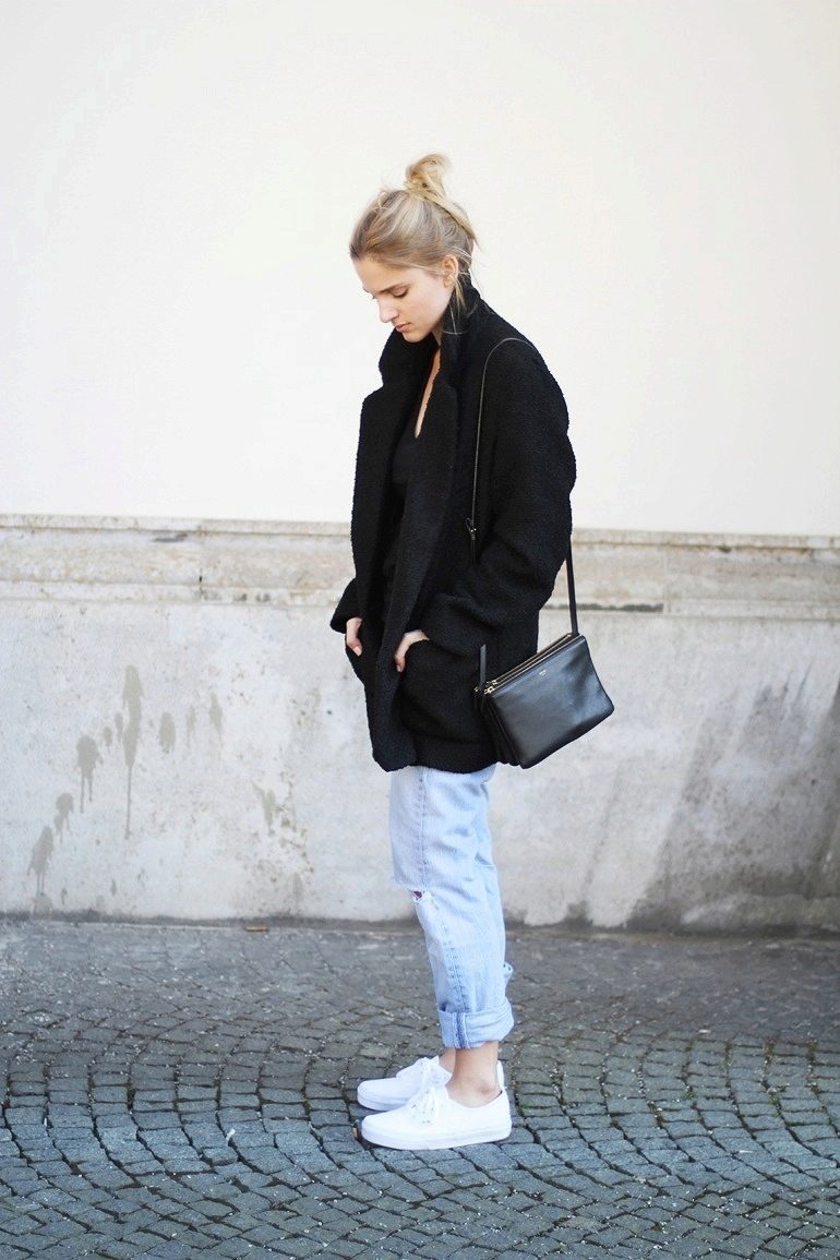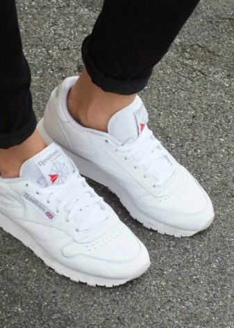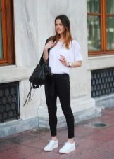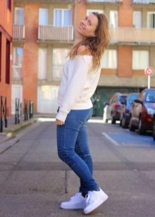 - Jeans - versatile clothing, perfect for combining with white leather sneakers. Skinny, pipes, boyfriends, straight - they all come to sports shoes.