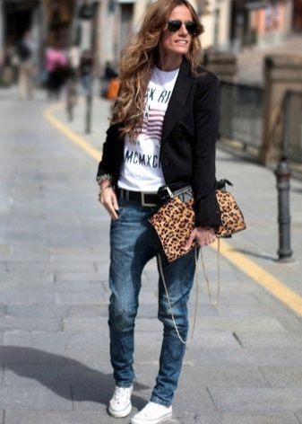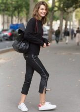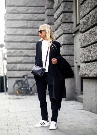- Sneakers and classic straight pants have long been a trend. The image takes on a shade of courage, attracts attention. At the top you can throw a jacket.