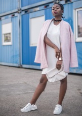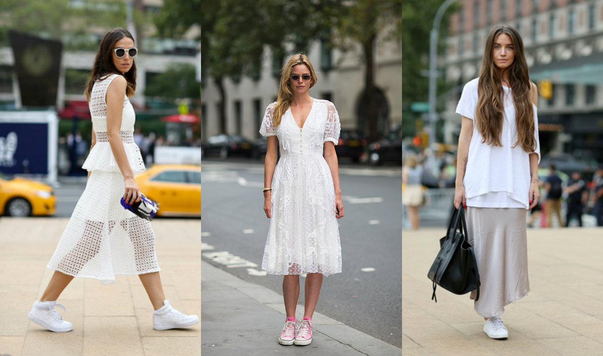 A dress in a linen style with white sneakers on rather dense soles and with round noses will suit the romantic look. Such images offer both well-known brands and the mass market.