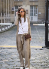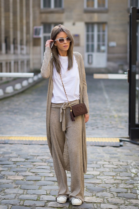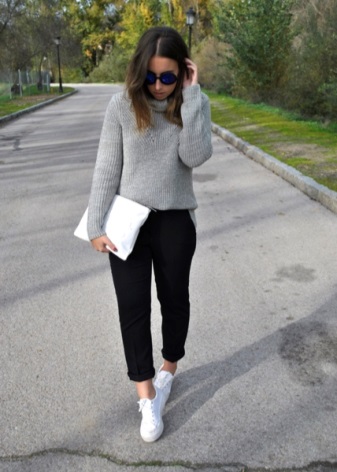 As another casual look, you can use a combination of sneakers with classic-style trousers and a blue or gray jumper. Change the image of the evening to help the jumper. A basic white t-shirt and a large-knit cardigan look beautiful along with the pants.