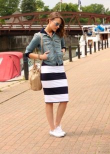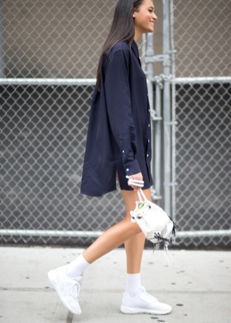 High top sneakers go well with oversize sweaters, men's-style shirts and short denim shorts. White sneakers perfectly complement the knit sets. Allow yourself in the summer tight-fitting knit top and midi skirt. If the top does not fit you, then replace it with a wide sweater in the color of the skirt.