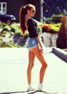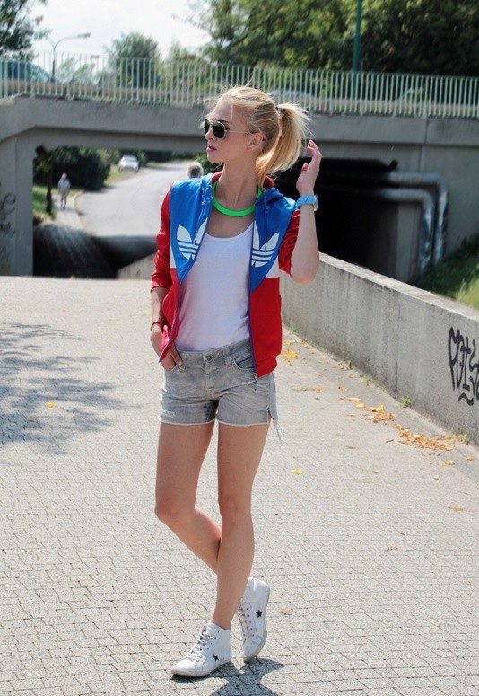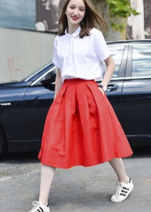 Style sport-chic is now at the peak of popularity among fashionistas. Bright krop-tops will look attractive along with inflated shorts and sneakers. If it became cool in the evening, replace the top with a sweet-shot. If you do not want to wear shorts, then experiment with a skirt. White sneakers and a wide pink skirt diversify white sneakers. In such clothes you will feel like a princess or barbie.