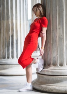 A little red dress can also be combined with white sneakers! But remember that the dress should be wide-cut and sporty. Stylish and fashionable dark-rimmed glasses only diversify your image of the rebellion.