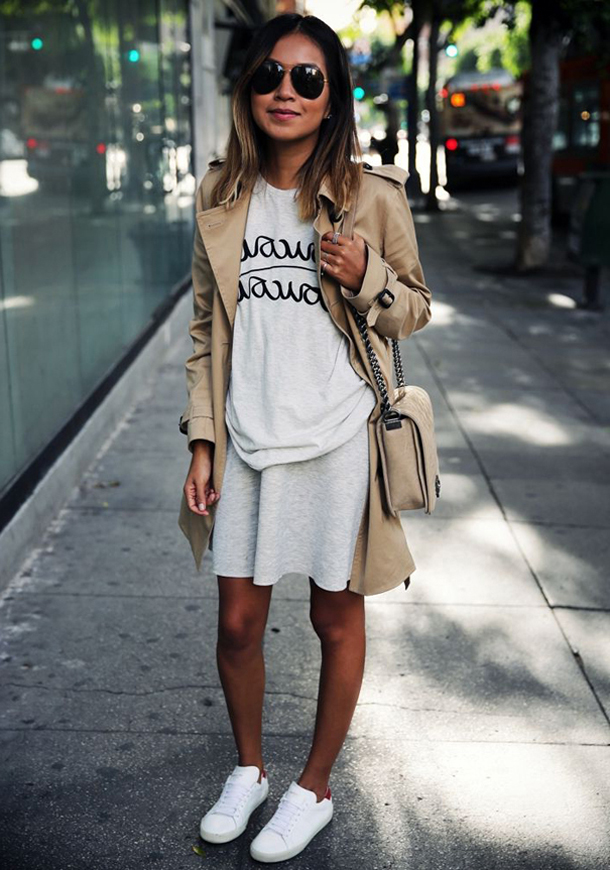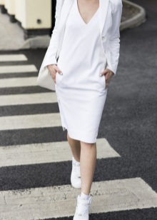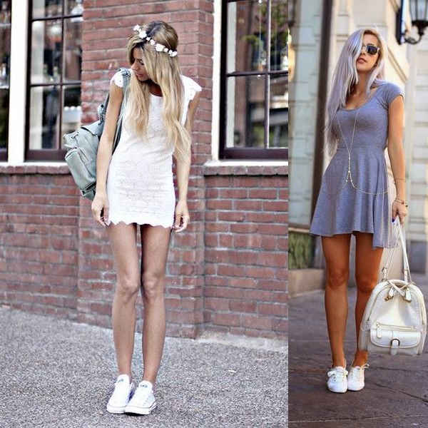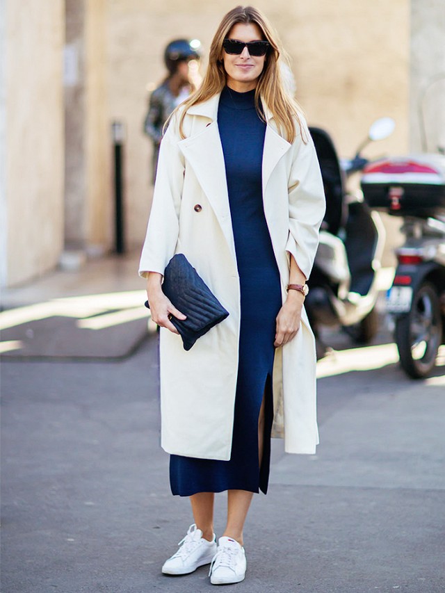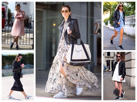 Russian women picked up a combination of a dress and sneakers from their European friends. They began to apply this fashionable trend in any style. Classic leather white sneakers are perfectly combined with a black, gray or beige skin-tight dress and leather jacket.