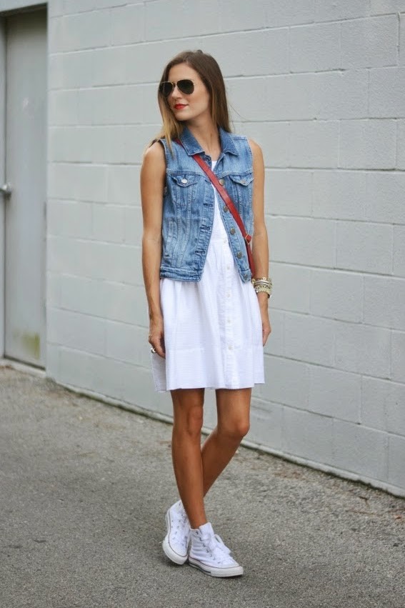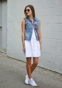 Completely white look is best suited to owners of dark-skinned skin. The classic style of this style are straight trousers or wide shorts with a shirt of a male cut. Romantic lace dresses with a denim jacket will look great.