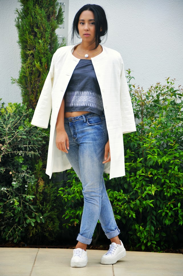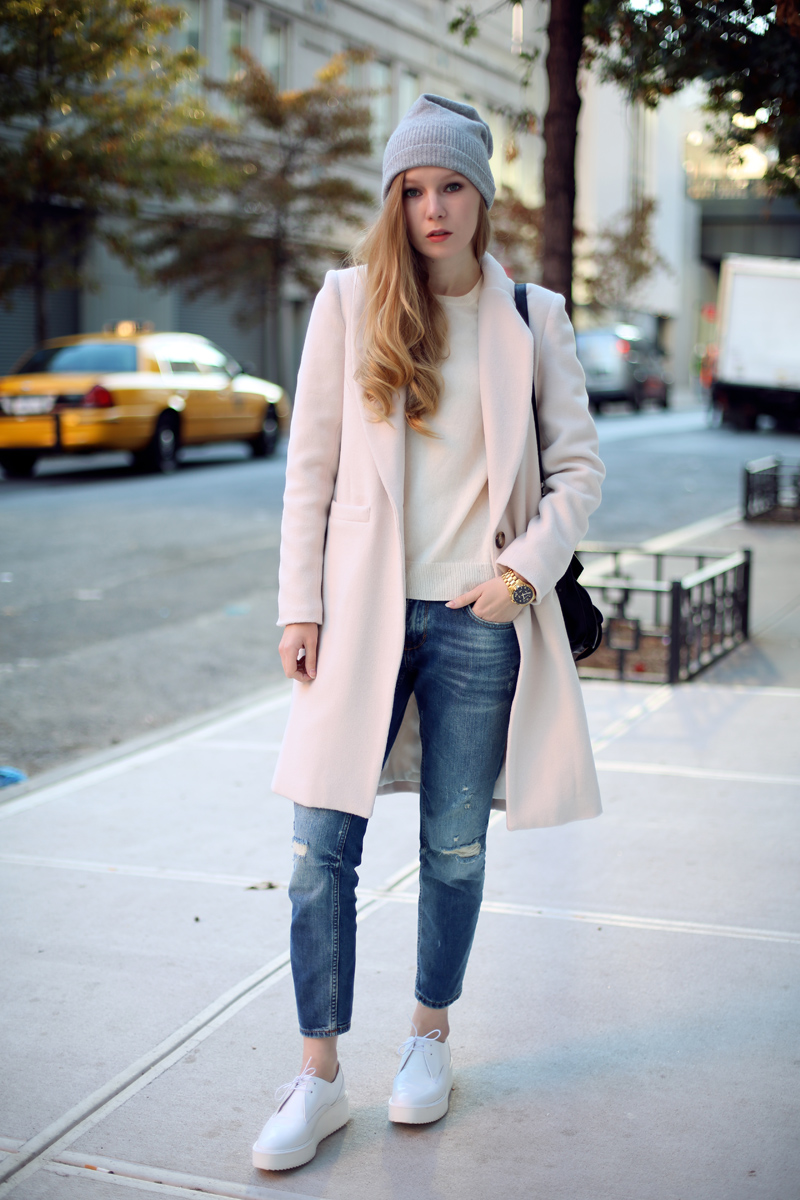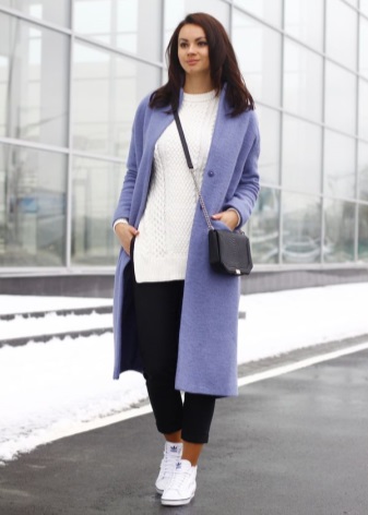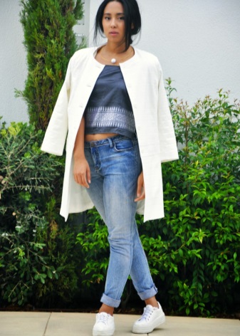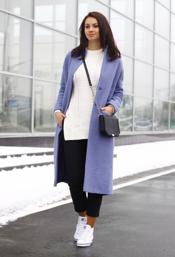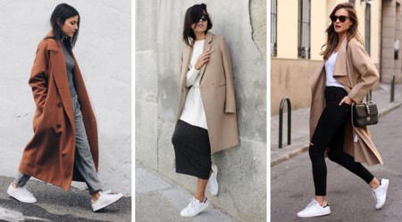 Sports sneakers on a flat sole can be successfully combined with high jeans and a wide coat to the floor.
