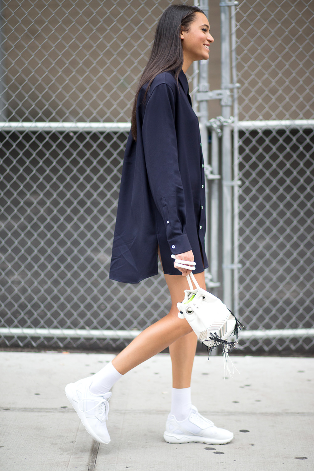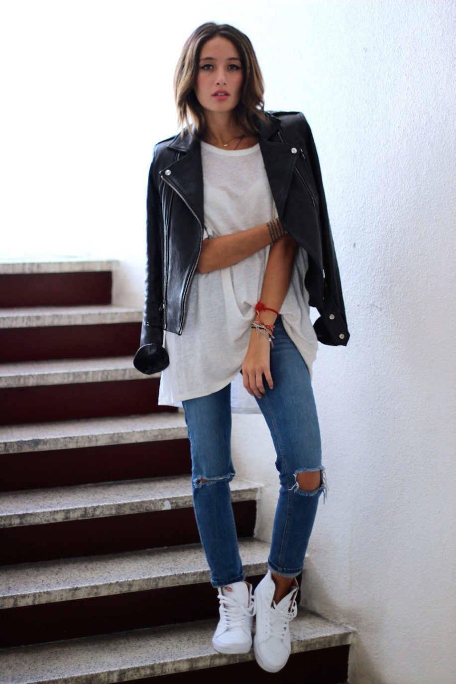 White sneakers are easiest to wear with boyfriend jeans and a loose, plain-colored shirt. Complete your look with a leather backpack and you can safely go to the office. This combination will be universal for any model of white sneakers. You can combine the image with rough running sneakers or, on the contrary, minimalistic sneakers.