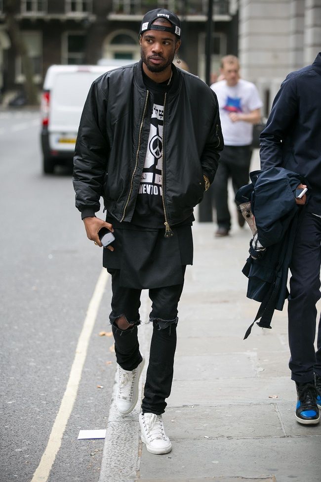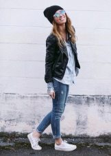 The specific style of "hip-hop" has long gone beyond its subculture. This style allows the young inhabitant of the metropolis to feel comfortable and relaxed. Black equal jeans, a loose long T-shirt and a black windbreaker can be effectively combined with white sneakers. A baseball cap with a snapback closure completes the look.