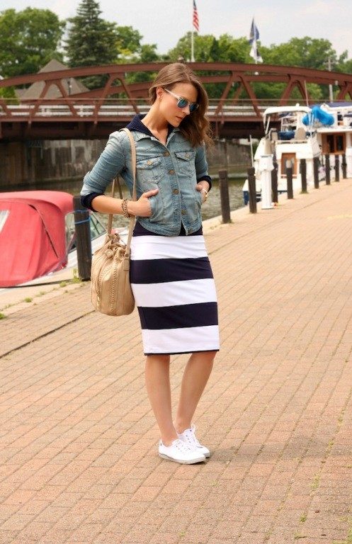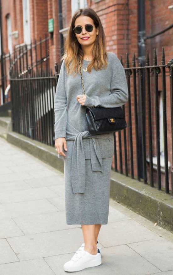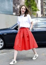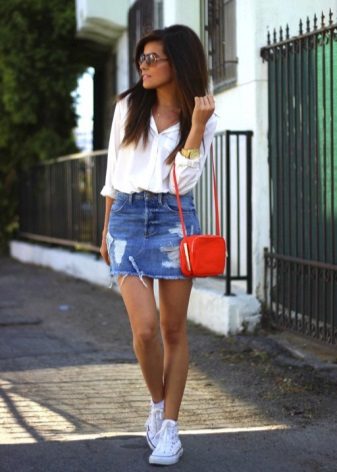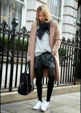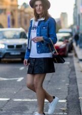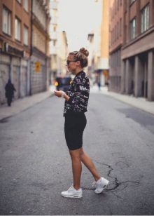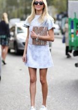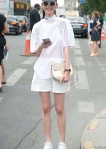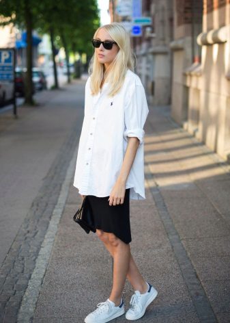 White sneakers can be worn with a skirt. In the summer, this may skirt the length of a mini at a high waist. White sneakers are also well combined with skirts of medium length and different silhouettes. It turns out an elegant and interesting image. Moscow women of fashion at the same time like to combine white sneakers with black tights. This is a rather extravagant and bold combination that requires careful attention to the details of the whole image.