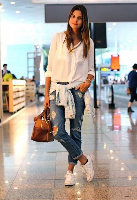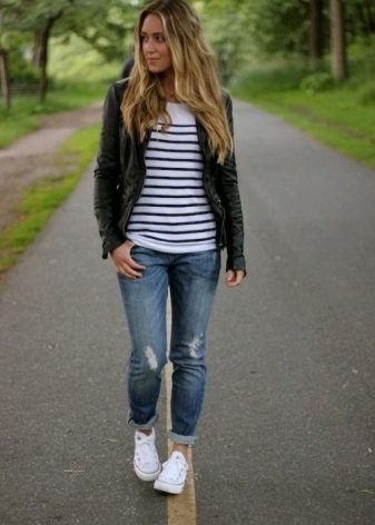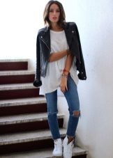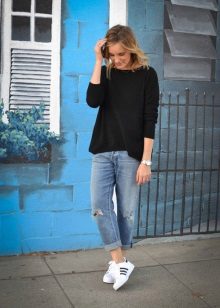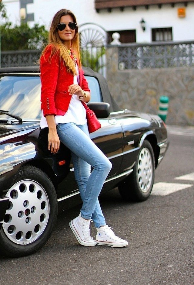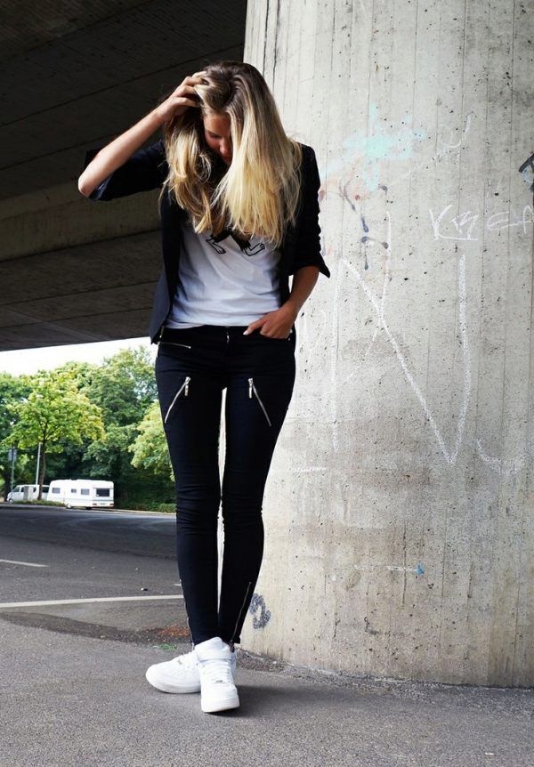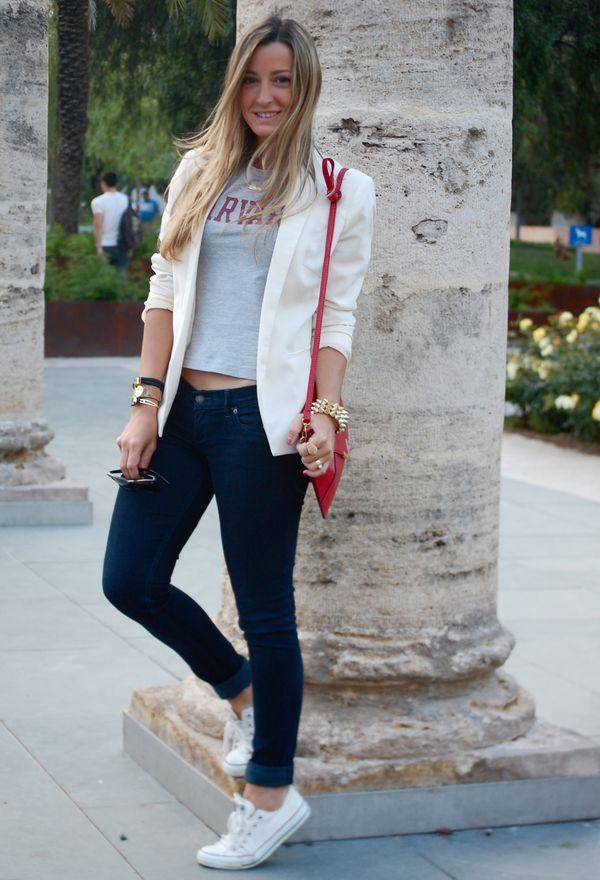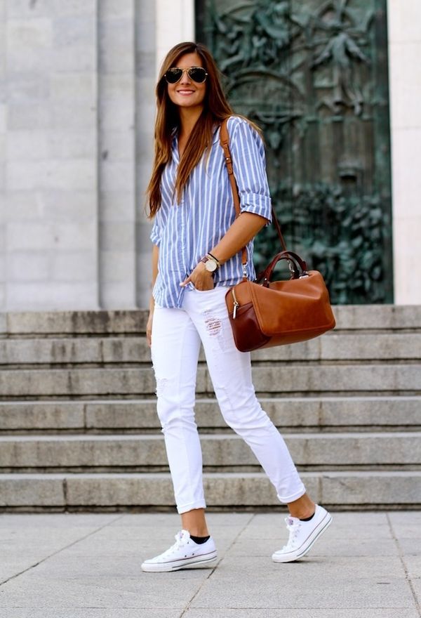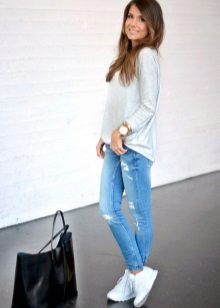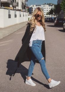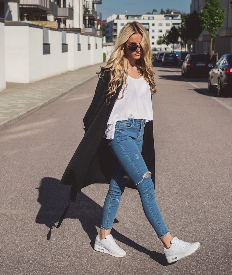 Of course, the most versatile option is a combination of white sneakers and denim. With cropped skinny jeans and boyfriends for girls. Men usually wear slim fit jeans and looser silhouettes with white sneakers. Denim colors are not restricted. The top can be absolutely anything, depending on the case and situation.