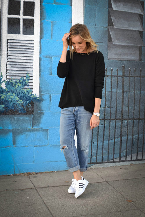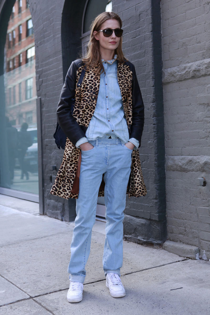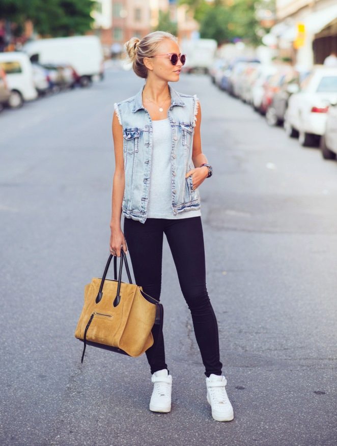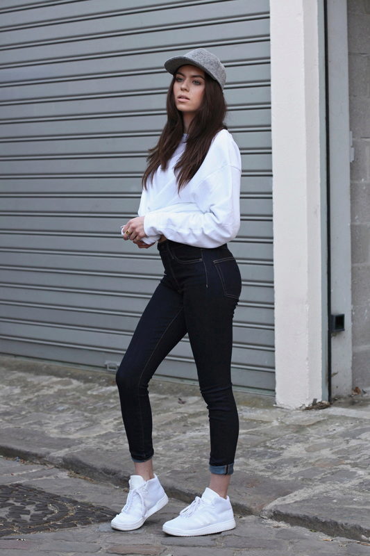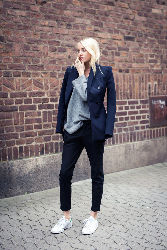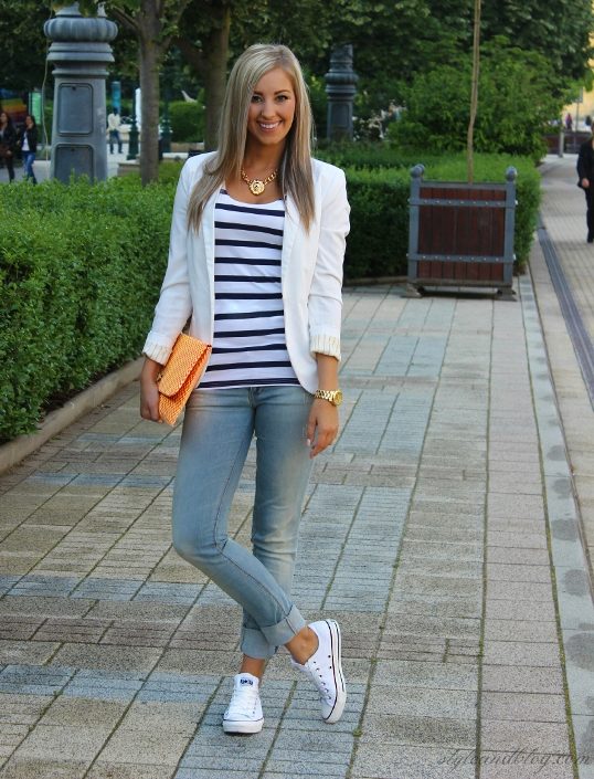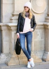 Of course, the most versatile option is a combination of white sneakers and denim. With cropped skinny jeans and boyfriends for girls. Men usually wear slim fit jeans and looser silhouettes with white sneakers. Denim colors are not restricted. The top can be absolutely anything, depending on the case and situation.