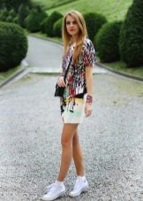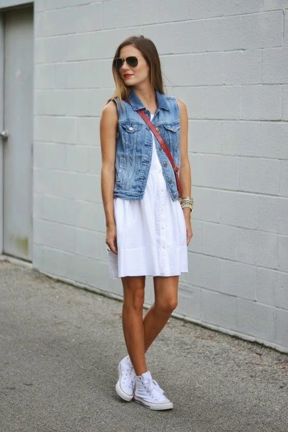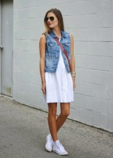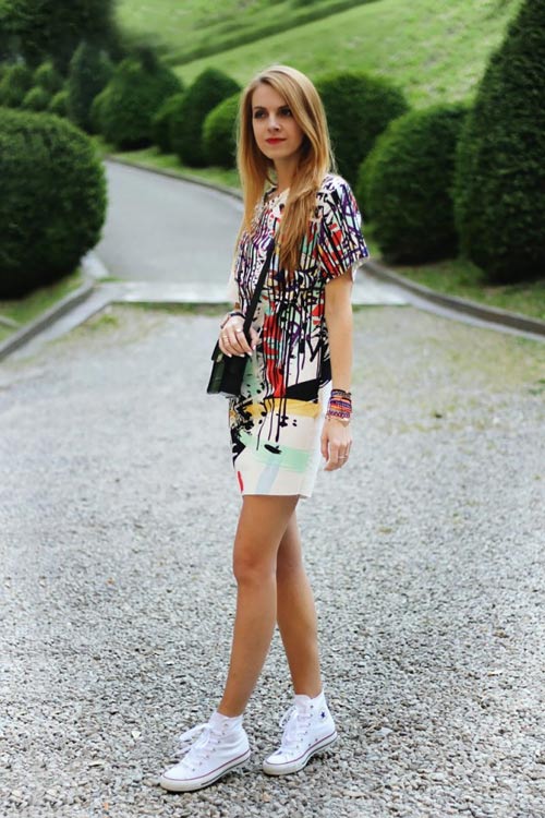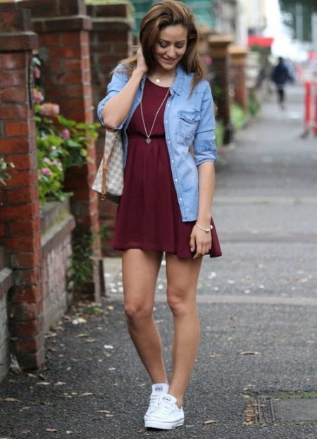 White short sneakers match perfectly with a bold, casual dress. Denim shirt will help to complete the look. For this bow it is best to pick a light textile bag.