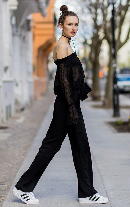 White sneakers are combined with a provocative sport-glam style. Black Adidas white sneakers with three black stripes will add variety to a black, elegant jumpsuit consisting of black loose pants and a translucent top.