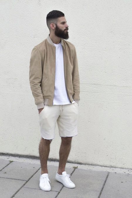 An interesting men's bow can be obtained thanks to the “expensive” combination of white sneakers on the platform with milky shorts and a snow-white T-shirt. The highlight of the image will be a dark beige windbreaker bomper.