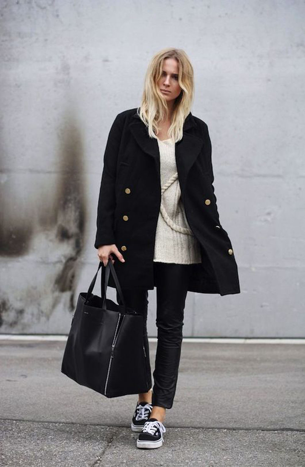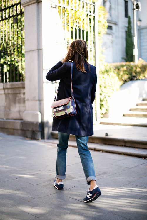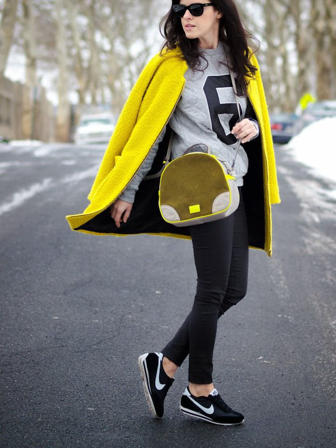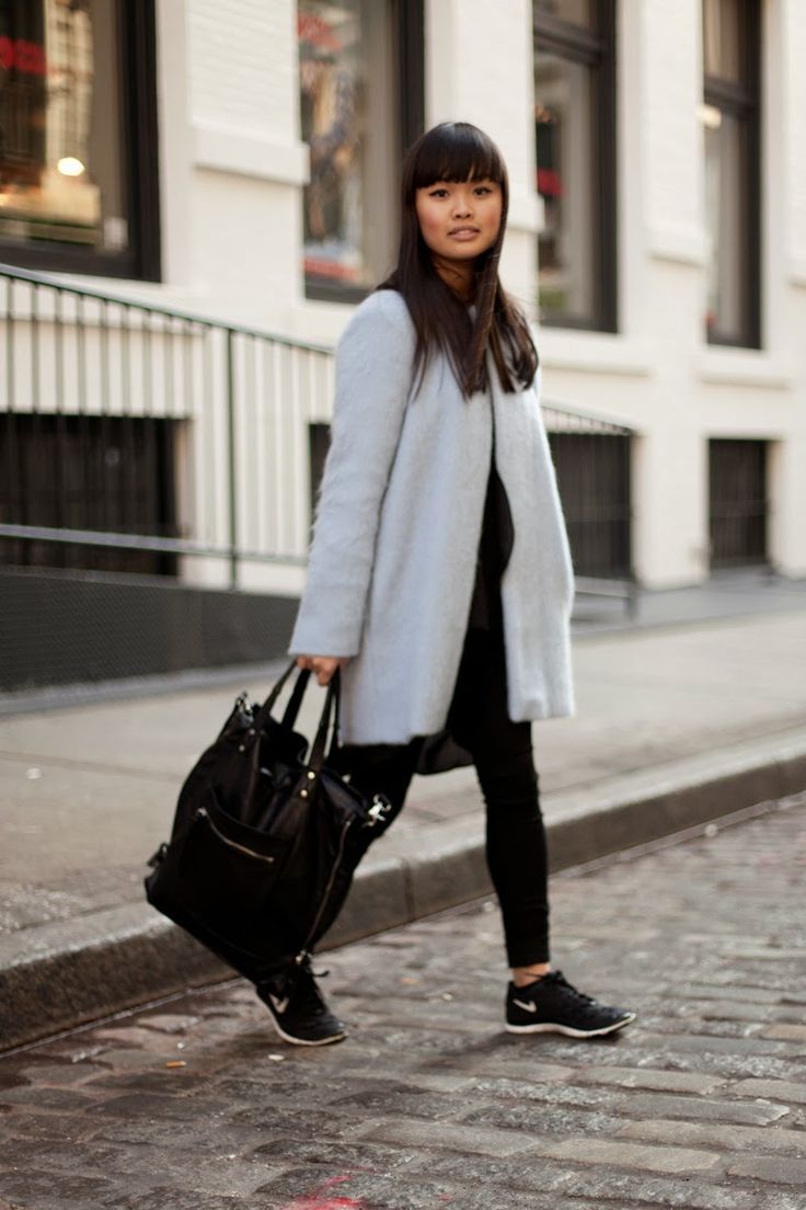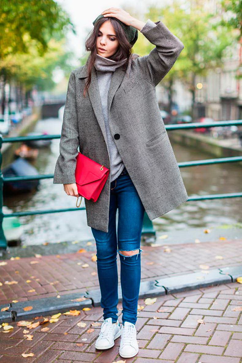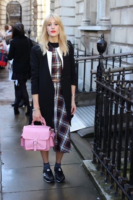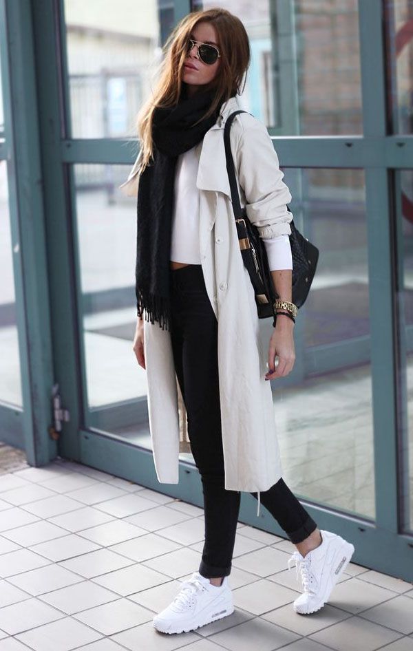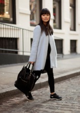 Sports shoes in combination with a coat - an extremely fashionable option. It is better if the coat is an oversized model. It has not been fashionable to combine the color of the bag and the shoes for a long time, this also applies to sneakers. Pick them up in the tone of the main accessory is not worth it. Feel free to choose a classic bag or clutch bag for sneakers and you can’t go wrong.