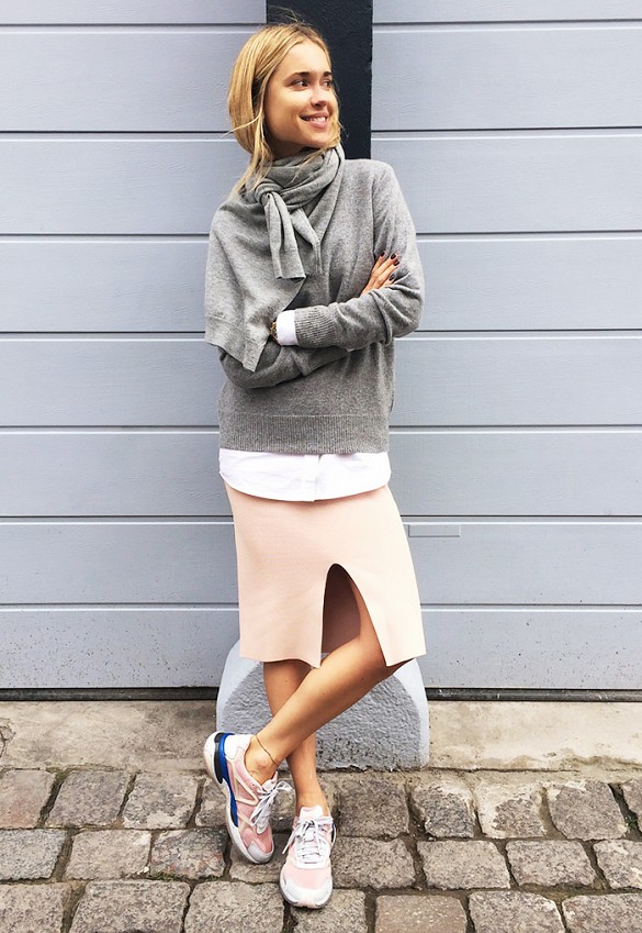 There is an opinion that sneakers with a pencil skirt are completely incompatible with each other. It is a myth. Pencil skirts look good with a cardigan, tank top and shoes that match the tone of one of the wardrobe items.