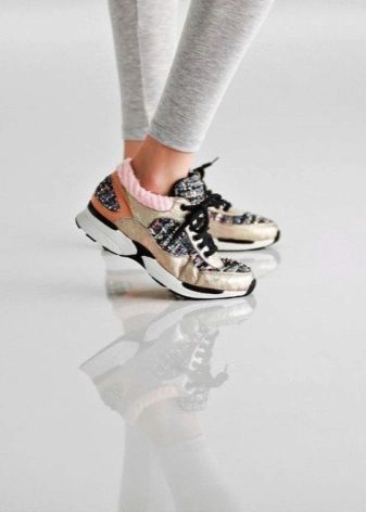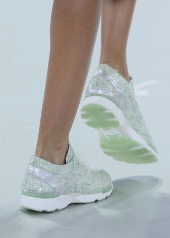 Sneakers from the French brand are presented in several models. The most popular classic sports version. Rough and massive, they are nevertheless beautiful and elegant. The shoes are made of genuine leather in combination with velvet. There are also knitted inserts. On the side, the products are decorated with the Chanel corporate logo (made of metal with shiny rhinestones), and the very name of the brand is behind it.