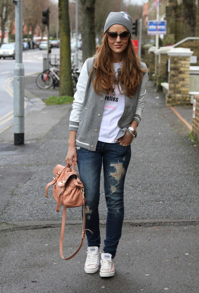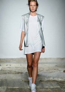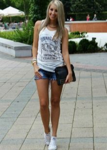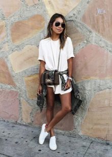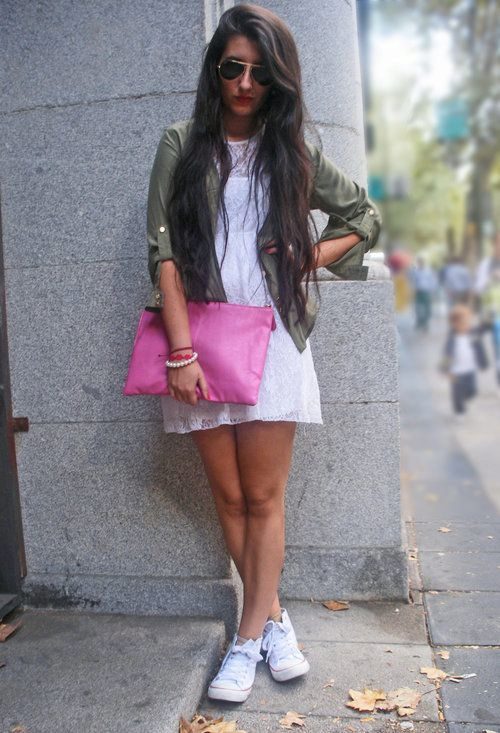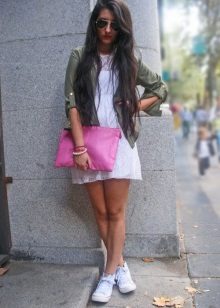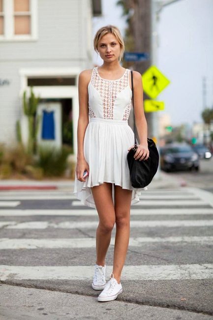 Young girls fit combination of sneakers and short dresses. Sneakers in this image symbolize style, audacity and originality.As an accessory, you can use a sports bag or backpack, and the hair is better to collect in the tail or bundle. This ensemble perfectly embody the style of Casual.