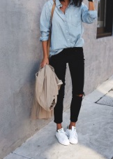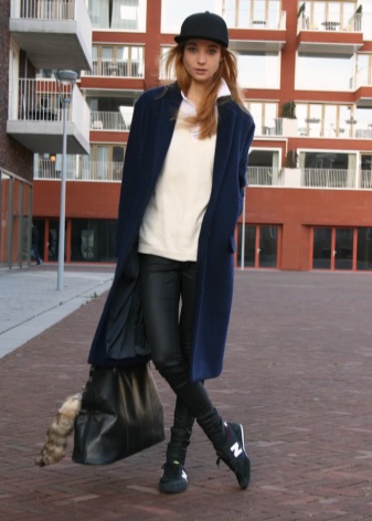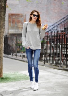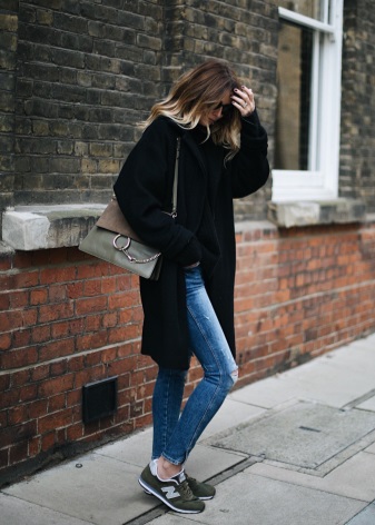 Snickers are the favorite demi-season model of fashionistas. Such sneakers visually lengthen the legs, and at the same time they are very comfortable. Blue sneakers with bright red accents look great with narrow black jeans, a blue coat and a gray cardigan.