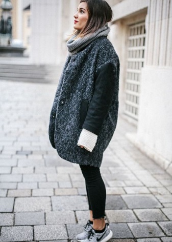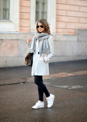 Looks very gently in black skinny jeans and a classic coat with a leather insert, complemented by a purple knit scarf and white and purple sneakers.