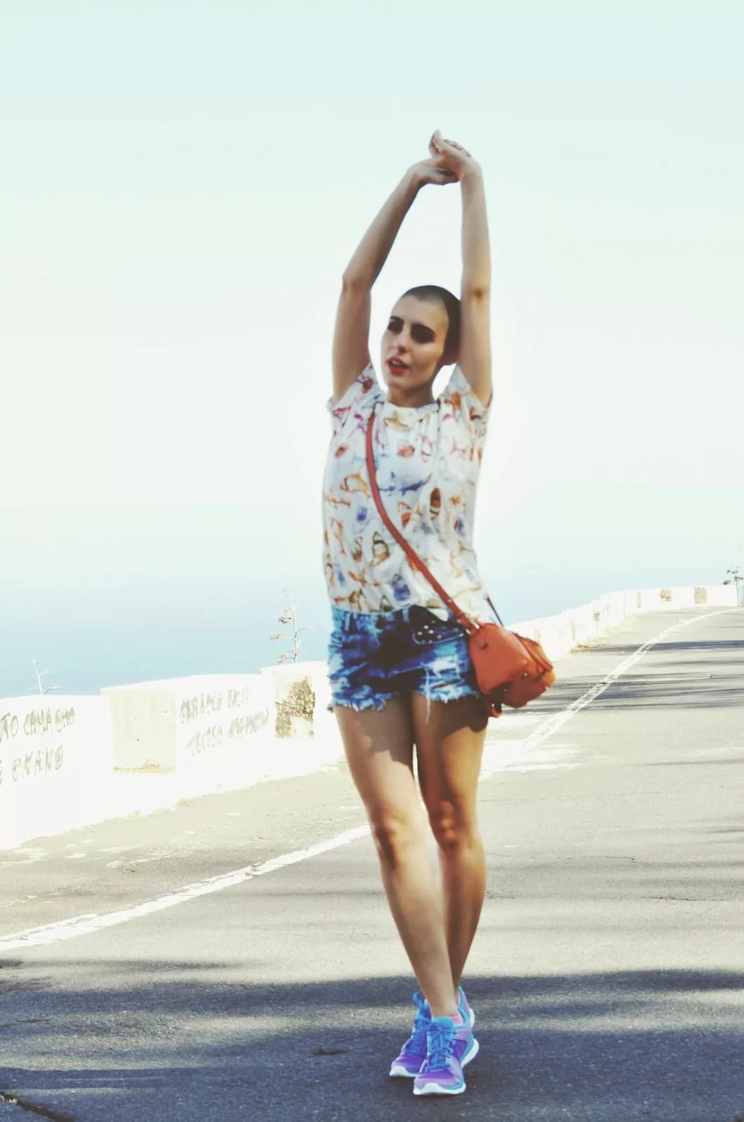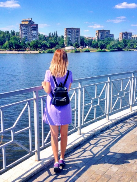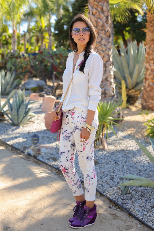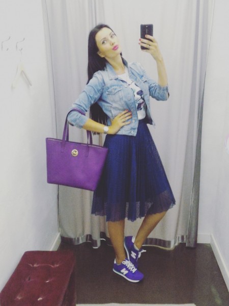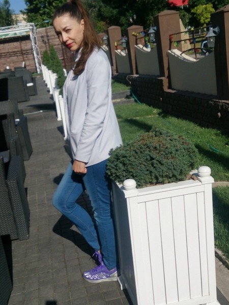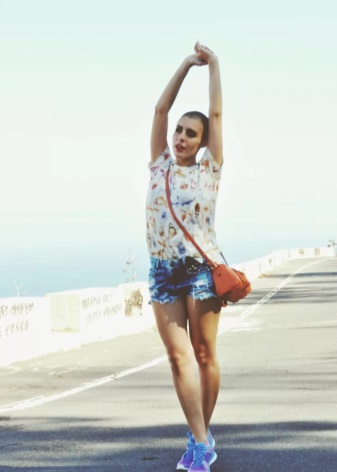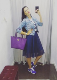 You can play on the contrast, you can choose to match the same purple. Look beautiful with all sorts of T-shirts, Hoodie, Olimp. On a hot day in the country, outside the city, on a journey is a great combination.