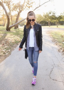 Universally, easily and naturally. Especially if the bottom is bright, an excellent pair will be a white T-shirt or a T-shirt with a print. In this dress you can go for a walk, to meet with friends.