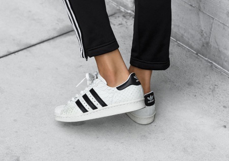 The corporation offers a huge amount of sports shoes and equipment. Women's Superstar sneakers are sold in two colors - black and white. This is a great classic shoes made of smooth leather, mesh lining and herringbone rubber sole.