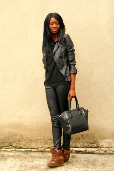 With jeans. In fact, a win-win option. Look at the photo. Girl in jeans and black tunic. In the hands of a black bulk bag. Pay attention to sneakers. They are bright leopard colors. In general, the image was a success. But if the sneakers were solid and dark brown or chocolate colors, the image would be pretty boring.