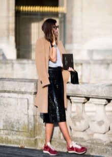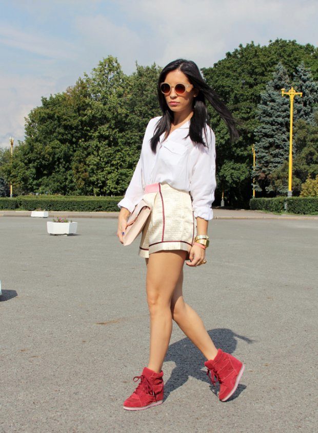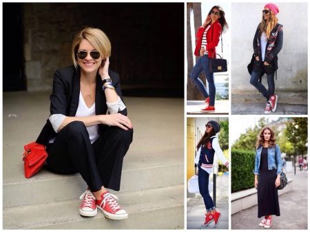 Definitely not worth wearing red sneakers with evening dress to the floor. Or with things that are dressed up by themselves. For example, tops with iridescent inscriptions. Or things in the fabric of which there are gold or silver threads.