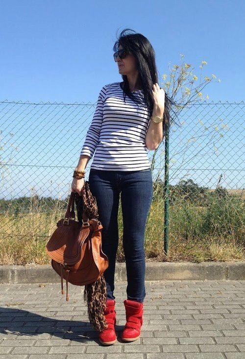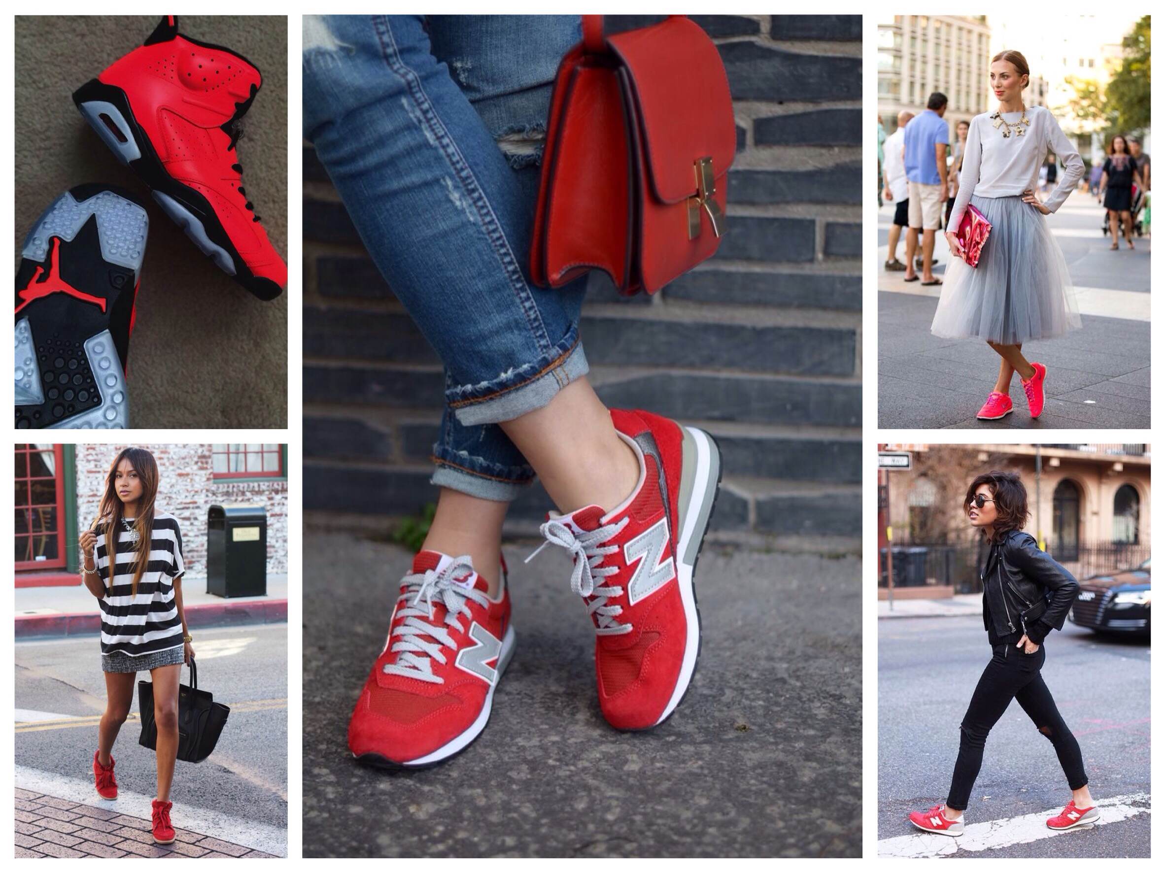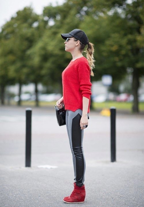 Check out the red sneakers with white sole. They look great with ripped jeans, leather leather jacket and vest. A red handbag here will be by the way. Look at the photo. This is an everyday look.