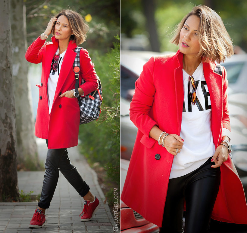 Pay attention to the color combination in this image. The emphasis is on red sneakers and a raincoat in the same color range. The rest of the clothes (black skinny jeans and voluminous black and white jacket jacket) are only the base, the basis for the manifestation of bright colors. A good look for every day.