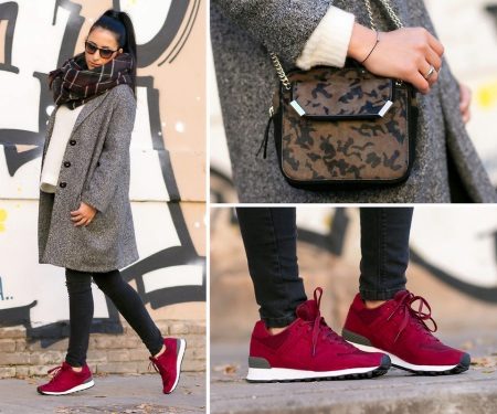 Autumn everyday option. Agree that if the girl had sneakers in the same color scheme as jeans and a coat (dark gray and light gray), the image would have turned out to be boring. And crimson sneakers on a white sole make the picture completely different. Stylish and expensive.