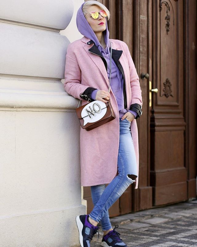 - Black leather sneakers with soft pink wide stripe on the sides and original blunt spikes on the nose;