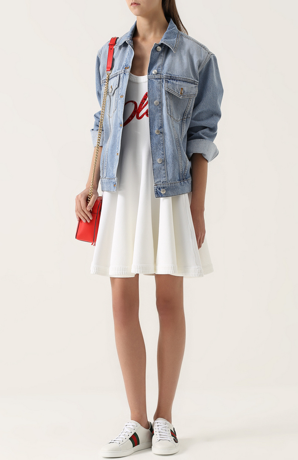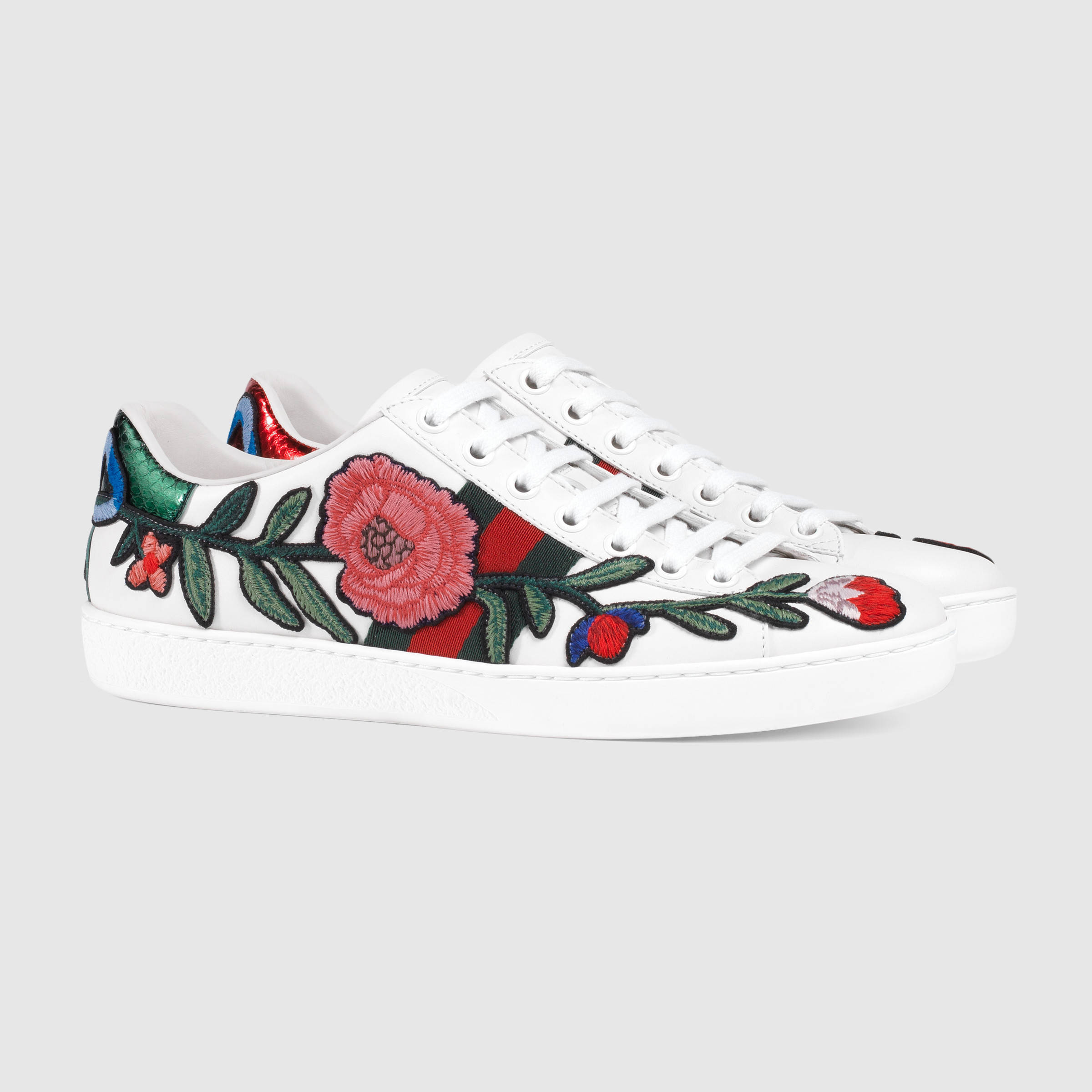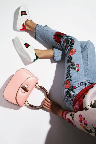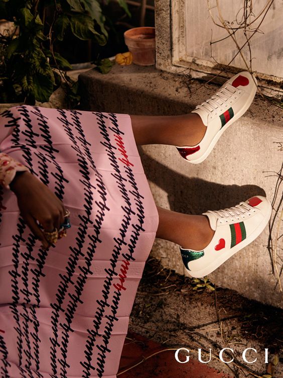 - Singer Taylor Swift often chooses Gucci Ace for everyday walks. This time she preferred sneakers, which are lavishly decorated with roses. She wears them with a concise denim sundress, a pink T-shirt and a crossbody bag.
