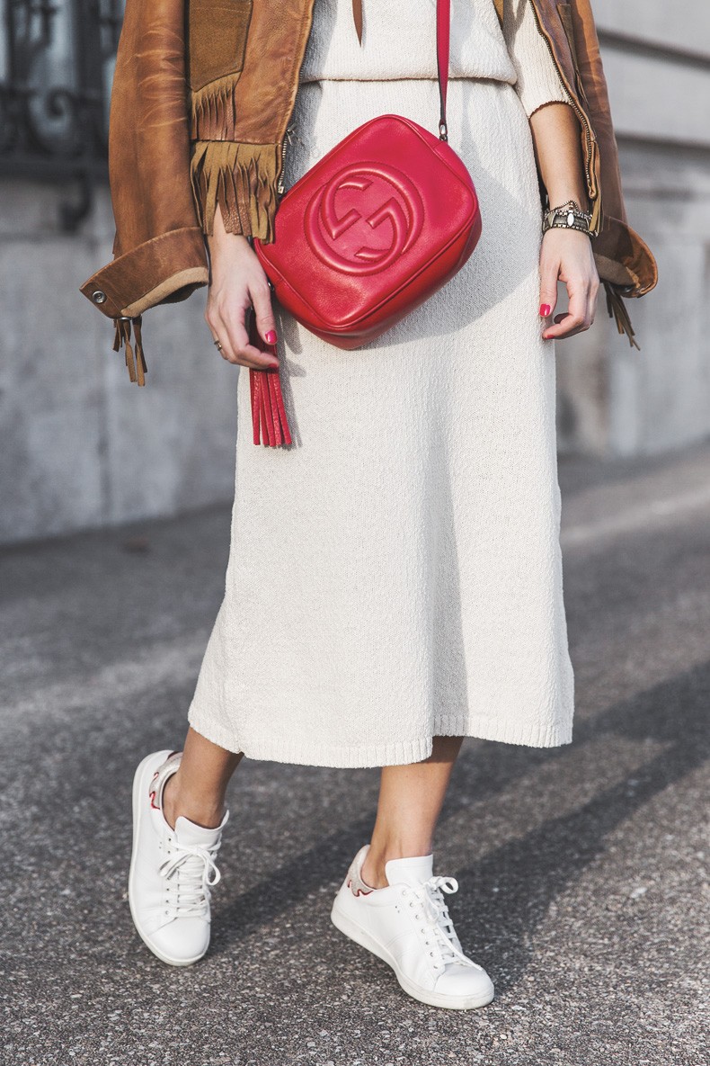 - Actress El Fanning is a fan of the brand, so she wears her Gucci Ace with a black laconic dress, black bomber jacket and a gorgeous Gucci Dionysus bag.